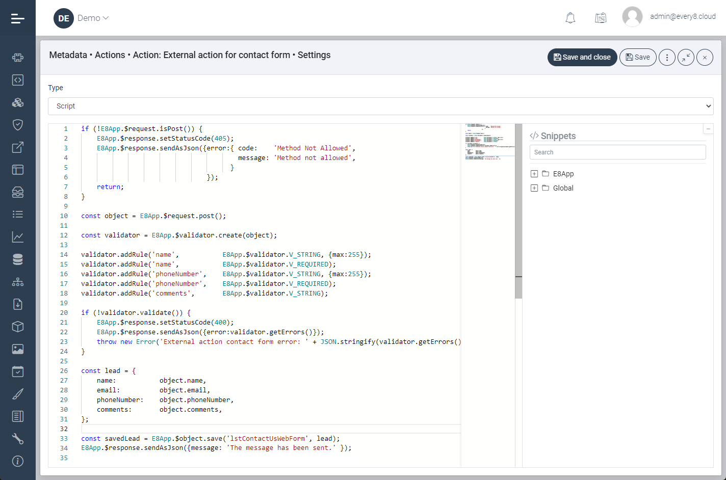 - In case of an incorrect type, we return the appropriate status (E8App.$response.setStatusCode(405))
