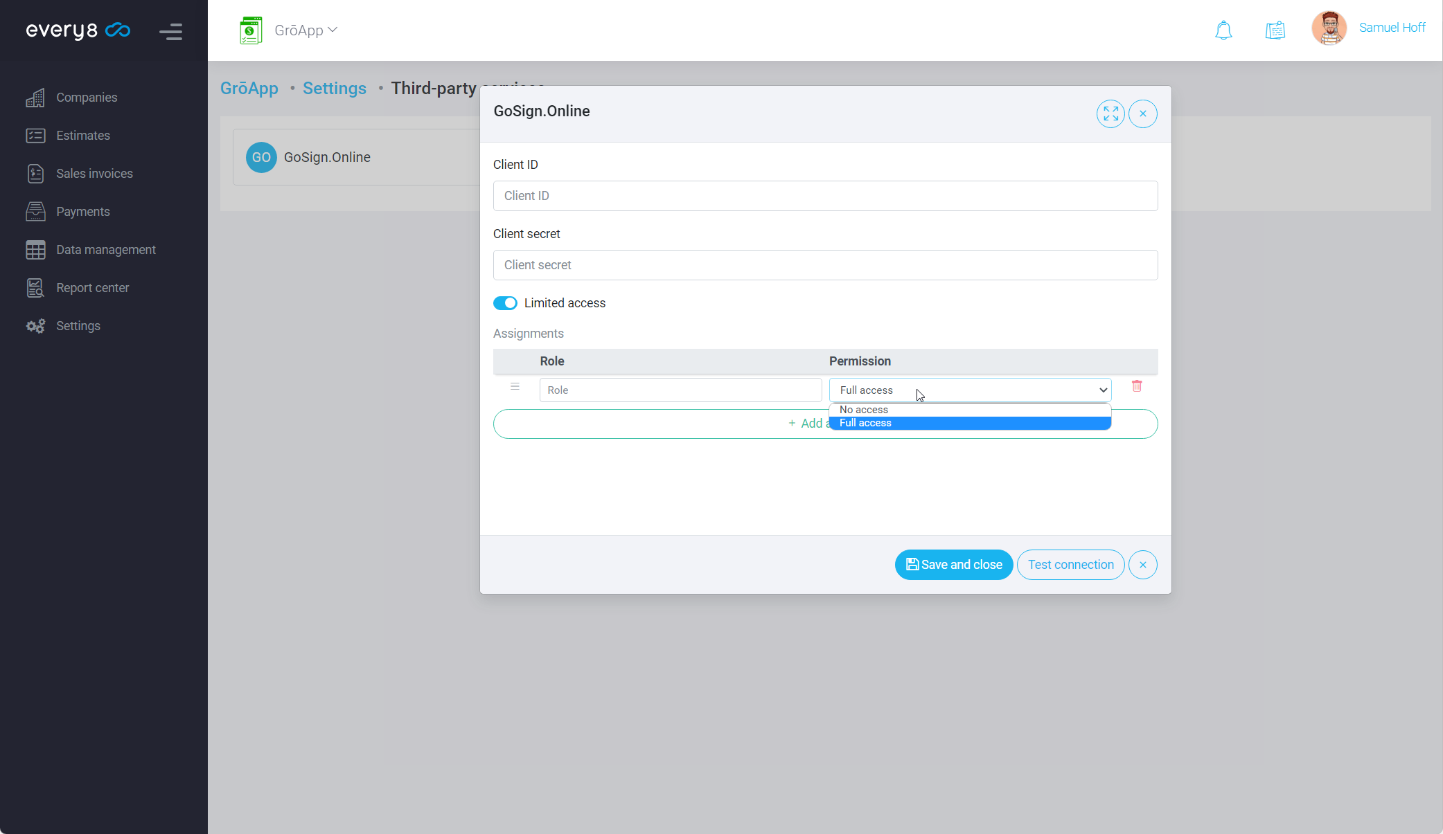- Click Connect and enter the parameters generated by the GoSign.Online platform.