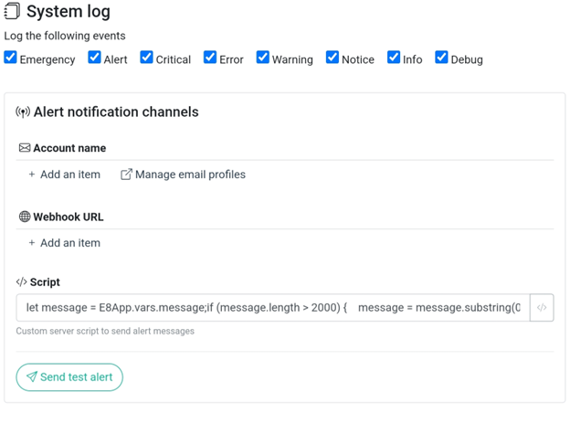 Email profiles. Add as many email profiles as you want to send automatic alerts. The email profiles have to be previously created as private or public. Each profile will be used to send an email to itself if an error occurs, ensuring that you are immediately notified of any issues.
